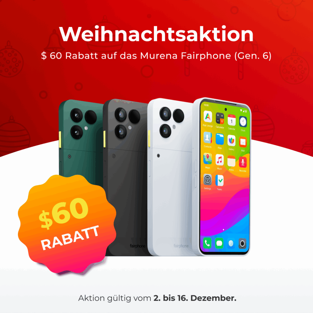 Für unsere Kundschaft in den USA bieten wir vom 2. bis 16. Dezember einen Rabatt von 60 US-Dollar auf das Murena Fairphone (Gen.6).