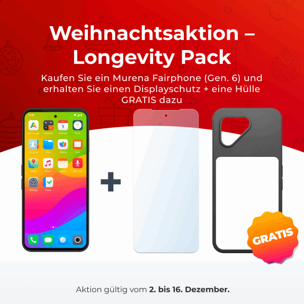 Vom 2. bis zum 16. Dezember erhalten Sie beim Kauf des Murena Fairphone (Gen. 6)-Bundles in unserem Online-Shop einen kostenlosen Displayschutz und eine kostenlose Schutzhülle dazu.