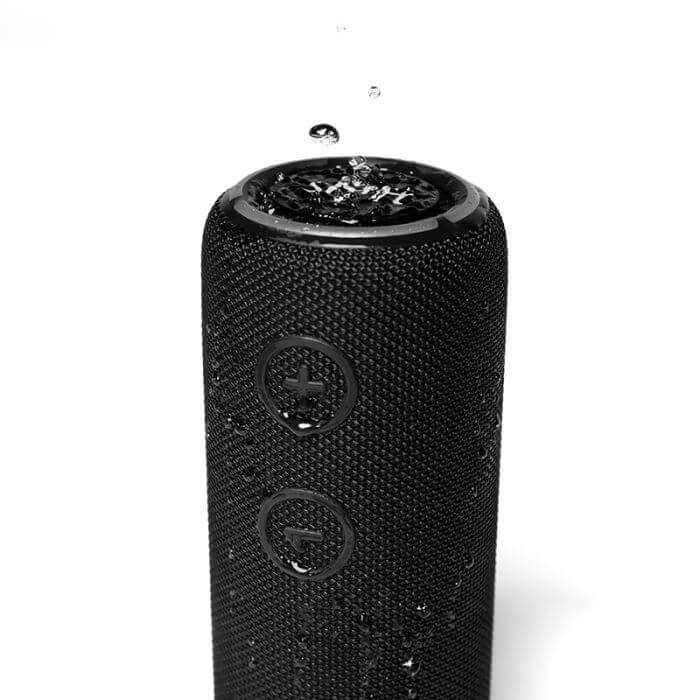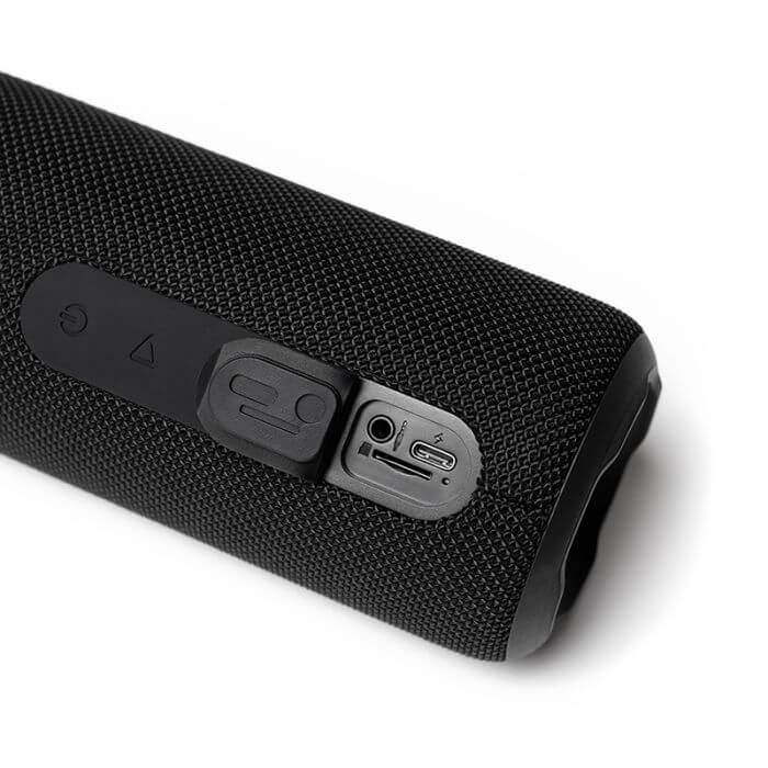 Batterie, Lautsprecher, Umgebungs-LED-Ring, äußere Textilabdeckung, obere und untere passive Membran, Schlaufe für das Armband und das Armband selbst, innere Gummiabdeckung für die Lautstärketasten und die Batterie-LEDs .