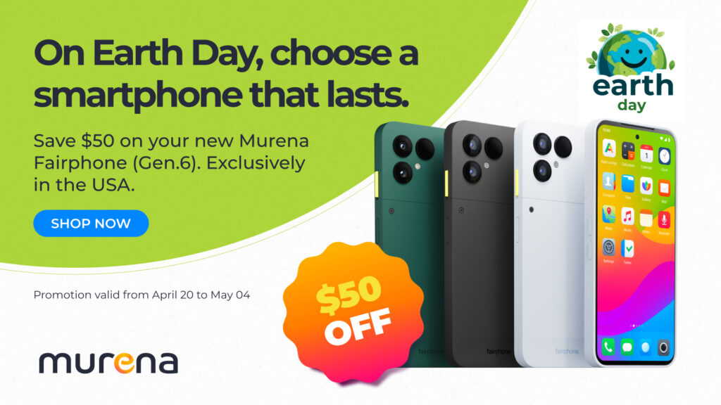 Wenn Sie zwischen dem 20. April und dem 4. Mai Ihr Murena Fairphone (Gen.6) bestellen, erhalten Sie eine gratis Schützhülle in der verfügbaren Farbe Ihrer Wahl sowie einen Standard-Displayschutz.