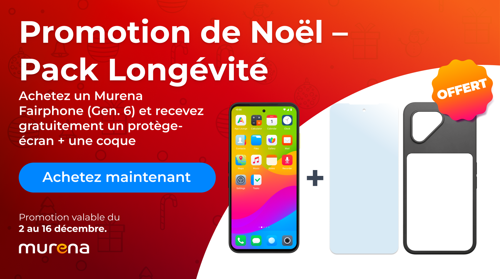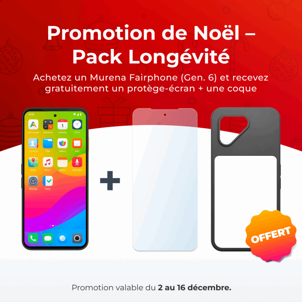 Du 2 au 16 décembre, lorsque vous sélectionnez le pack Murena Fairphone (Gen. 6) dans notre boutique en ligne, vous recevez gratuitement une protection d’écran et une coque de protection.