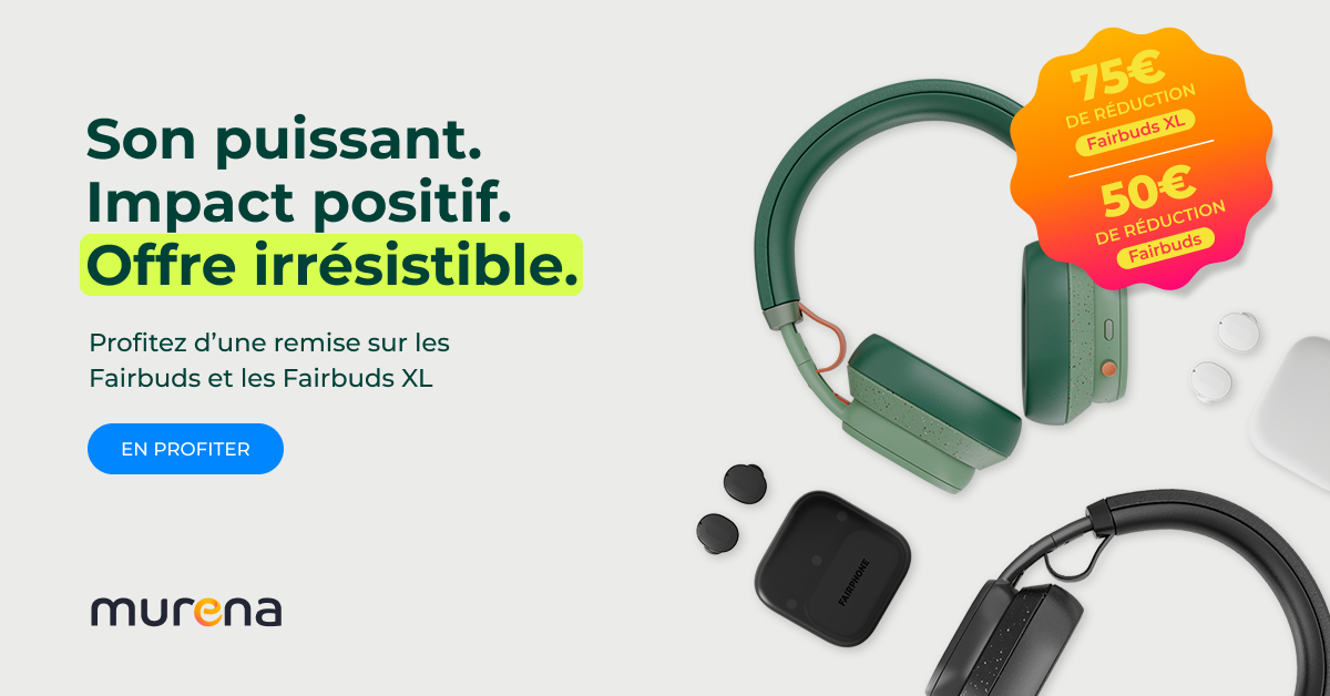 Ce mois-ci, nous offrons une réduction spéciale sur les produits audio de Fairphone chez murena.com. Profitez de 75 € de réduction sur Fairbuds XL et de 50 € de réduction sur Fairbuds.