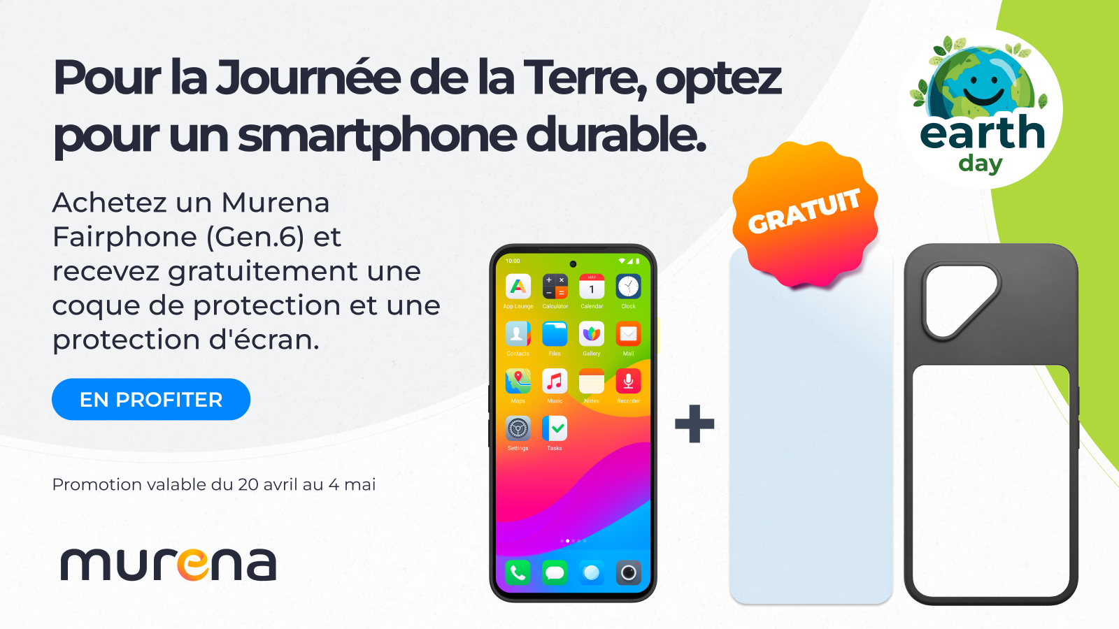 Du 20 avril au 4 mai, achetez votre Murena Fairphone (Gen.6) et recevez gratuitement une coque de protection dans la couleur de votre choix ainsi qu’une protection d’écran standard.