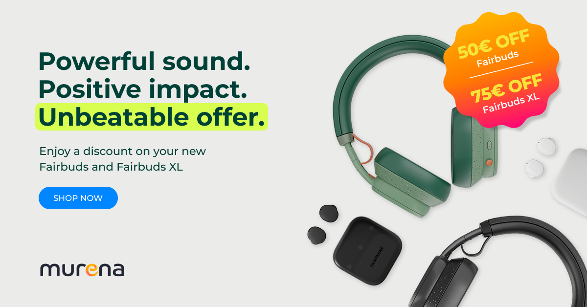 This month we offer a special price reduction for audio products from Fairphone at murena.com. Enjoy 75 $/€ off for Fairbuds XL and 50 $/€ off Fairbuds.