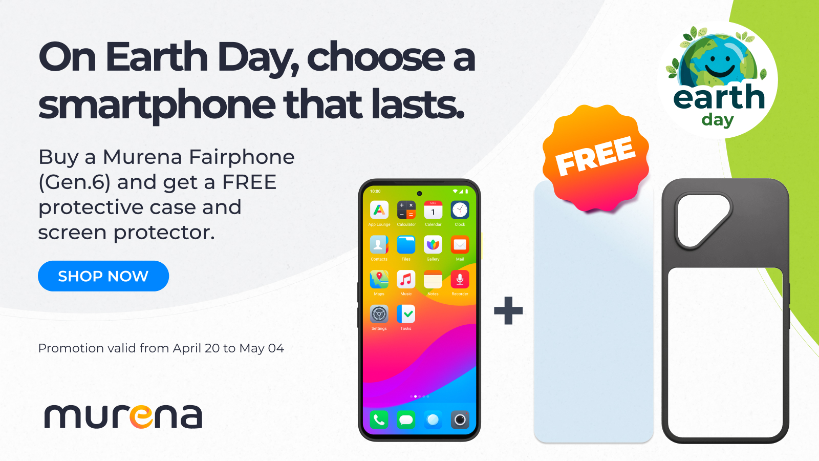 From April 20 to May 4, purchase your Murena Fairphone (Gen.6) and receive a free protective case with the available color of your choice and a standard screen protector.